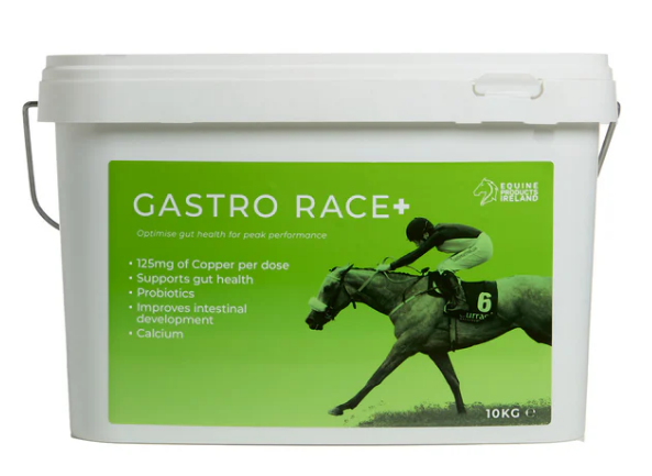A daily use Gastric supplement designed with your horse's gastric health and well being in mind. Containing prebiotics to support fiber digestibility, gut health and nutrient assimilation in the hindgut. Gastro Race + is also high in probiotics which encourage the growth of beneficial bacteria already present in the horse's small intestine helping to improve your horses overall health and digestion. Probiotics help to maintain proper pH levels, absorption of nutrients, feed efficiency and aid immune health. Gastro Race + contains a proven gastric buffer in Acid Buf which is manufactured from calcareous marine algae, which is harvested from clean, unpolluted waters off the coast of Ireland and Iceland. It is a highly effective buffer and pure source of bioavailable minerals deposited within its structure by the sea, especially calcium and magnesium. Gastro Race + is a multidimensional approach to supporting gastric health as it also contains 125 mg of copper per dose.